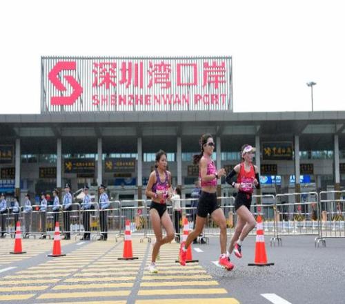 11月15日,参赛选手在比赛中经过深圳湾口岸,当日第十五届全国运动会田径项目女子马拉松比赛举行,赛事跨越深圳、香港,是全运会历史上首个跨境马拉松赛事。新华社记者 丁增尼达 摄