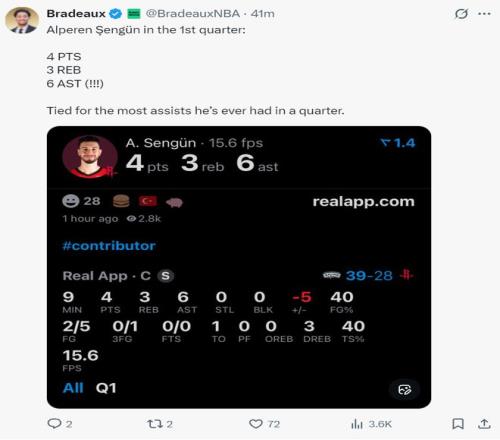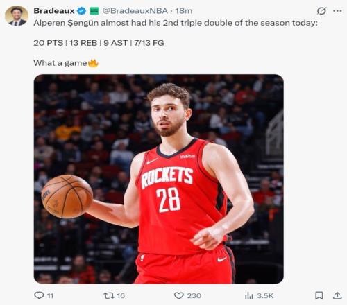 火记Bradeaux:申京今晚在场上移动得极为出色。为火箭队贡献了全方位的表现,他只需要做好自己就行。
