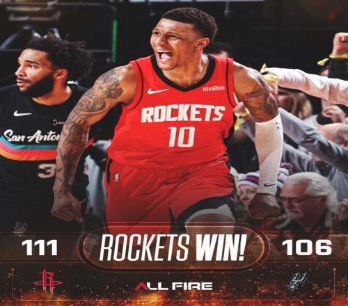 北京时间1月21日,NBA常规赛,火箭以111-106逆转马刺拿到三连胜。这场比赛火箭一度落后马刺16分之多,末节谢泼德率先吹响反攻号角,随后杜兰特、小贾、申京都挺身而出,尤其是申京在终场前36秒完成决胜一击,这一球拉开到4分,随着马刺两个三分不中火箭锁定胜局。