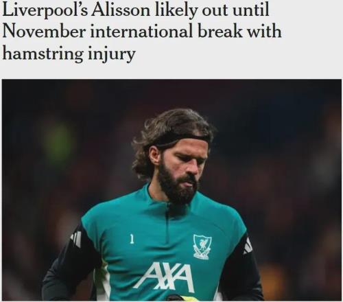 据The Athletic记者David Ornstein报道,利物浦门将阿利松在对阵加拉塔萨雷的欧冠小组赛中受伤,预计将因腿筋伤势缺席至11月国际比赛日之后(大概为六周)。报道称,33岁的阿利松已在